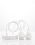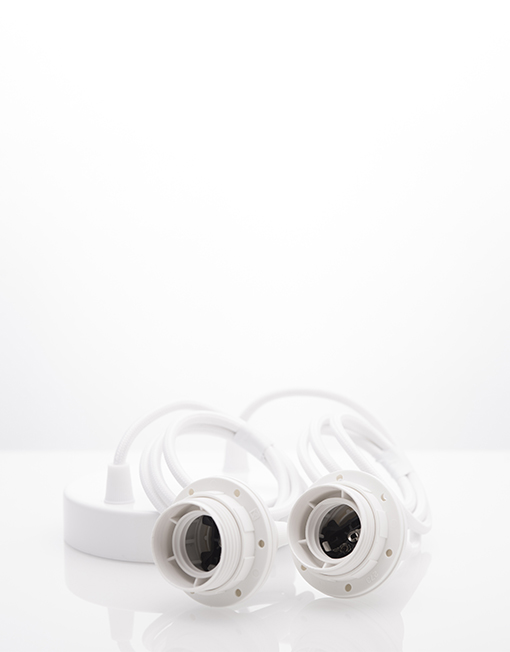 Zweifaches Leuchtenpendel, inklusive weißem Metall-Deckenbaldachin, 2x 1m weißem Textilkabel & 2 weißen E27 Kuststoff-Fassungen. An diesem Pendel lassen sich